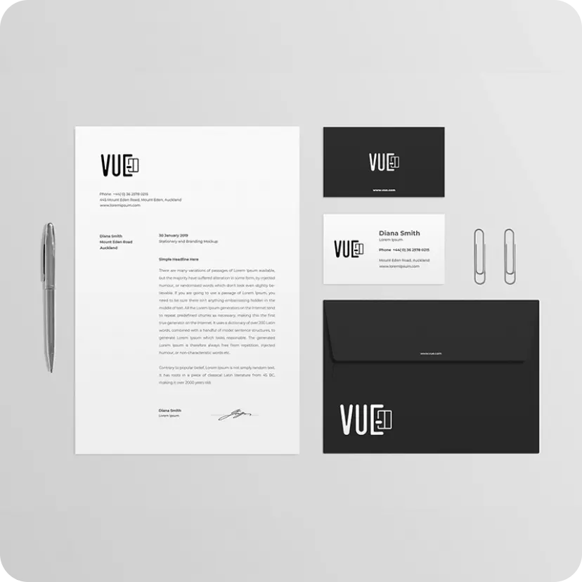The layout system for VUE is built on a structured grid that emphasizes balance, alignment, and clarity. Clean spacing and well-defined margins create an organized and breathable visual flow, reflecting the brand’s minimalist and architectural approach.